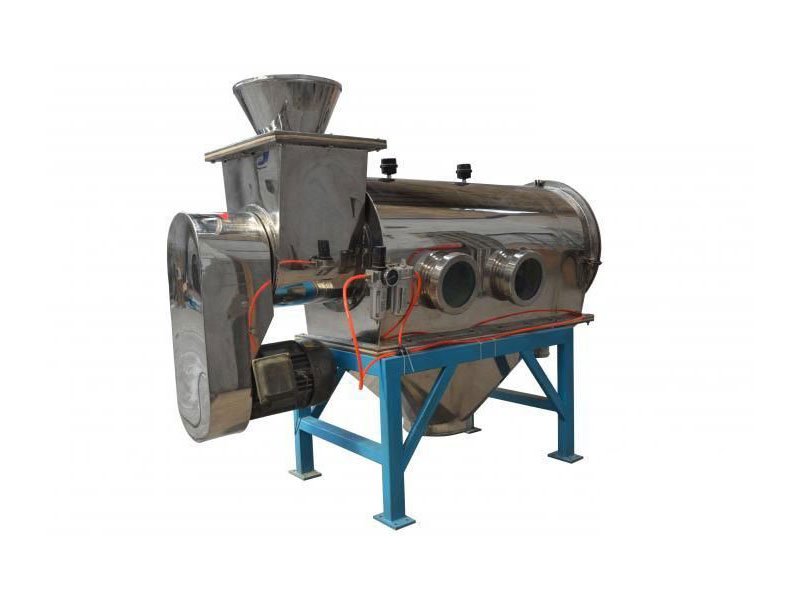 本设备筛网为圆筒状,置于机体内,物料通过螺旋输送系统后,和气流混合、雾化进入网筒内,通过网筒内风轮叶片使物料同时受离心力和旋风推进力,从而迫使物料喷射过网,由细料排出口排出,不能过网的物料沿网筒壁从粗料口排出。